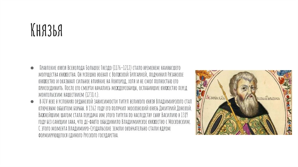 Князья● Правление князя Всеволода Большое Гнездо (1176–1212) стало временем наивысшего