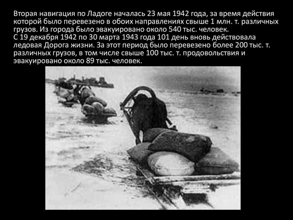 Вторая навигация по Ладоге началась 23 мая 1942 года, за время действиякоторой было перевезено в обоих направлениях свыше 1 млн. т. различных