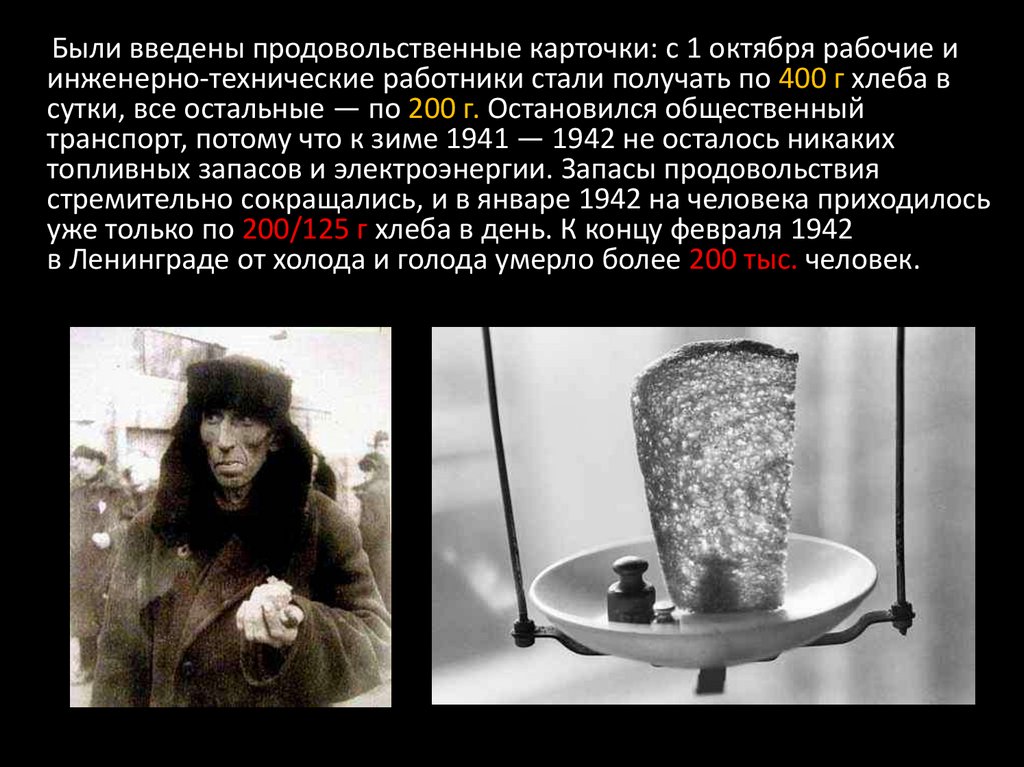 Были введены продовольственные карточки: с 1 октября рабочие иинженерно-технические работники стали получать по 400 г хлеба в