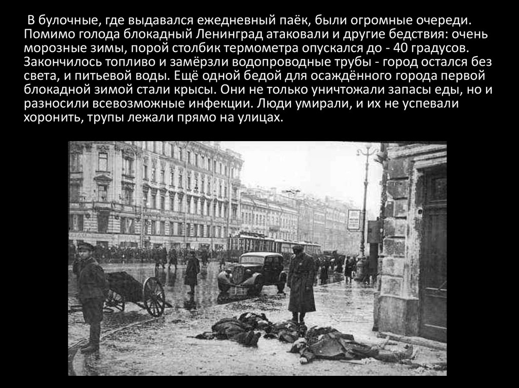 В булочные, где выдавался ежедневный паёк, были огромные очереди.Помимо голода блокадный Ленинград атаковали и другие бедствия: очень