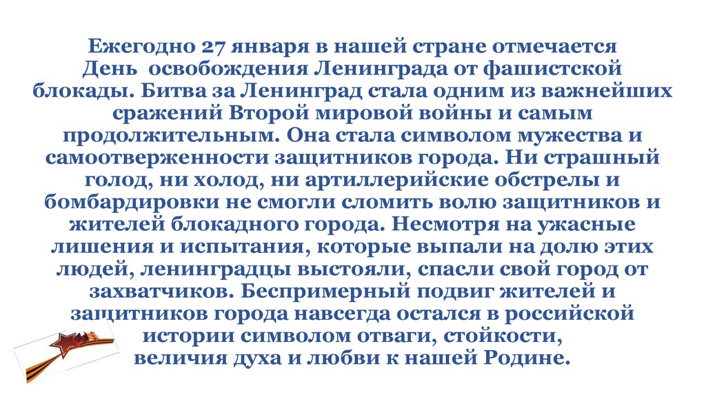 Ежегодно 27 января в нашей стране отмечаетсяДень освобождения Ленинграда от фашистской
