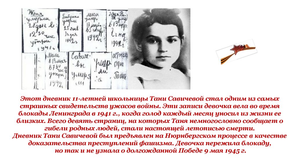 Этот дневник 11-летней школьницы Тани Савичевой стал одним из самыхстрашных свидетельств ужасов войны. Эти записи девочка вела во время