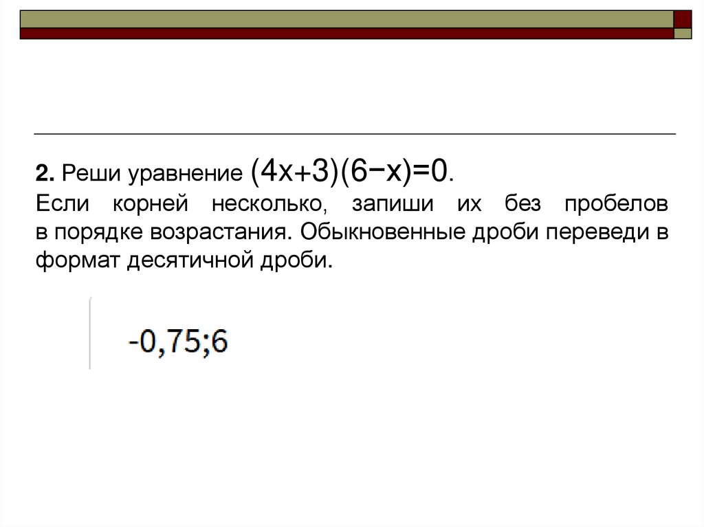 2. Реши уравнение (4x+3)(6−x)=0.Если корней несколько, запиши их без пробелов