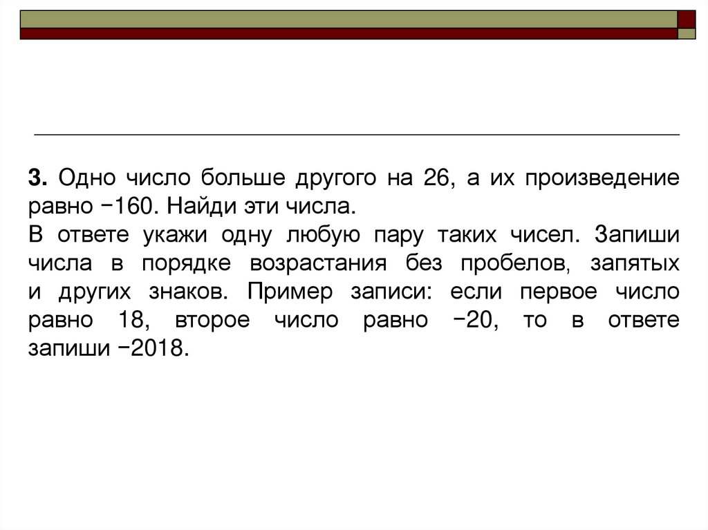 3. Одно число больше другого на 26, а их произведениеравно −160. Найди эти числа.