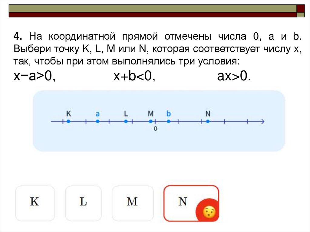 4. На координатной прямой отмечены числа 0, a и b.Выбери точку K, L, M или N, которая соответствует числу x,