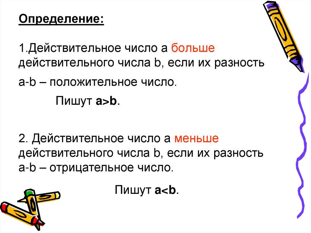 7. Определение: 1.Действительное число а больше действительного числа b, если их разность а-b – положительное число.