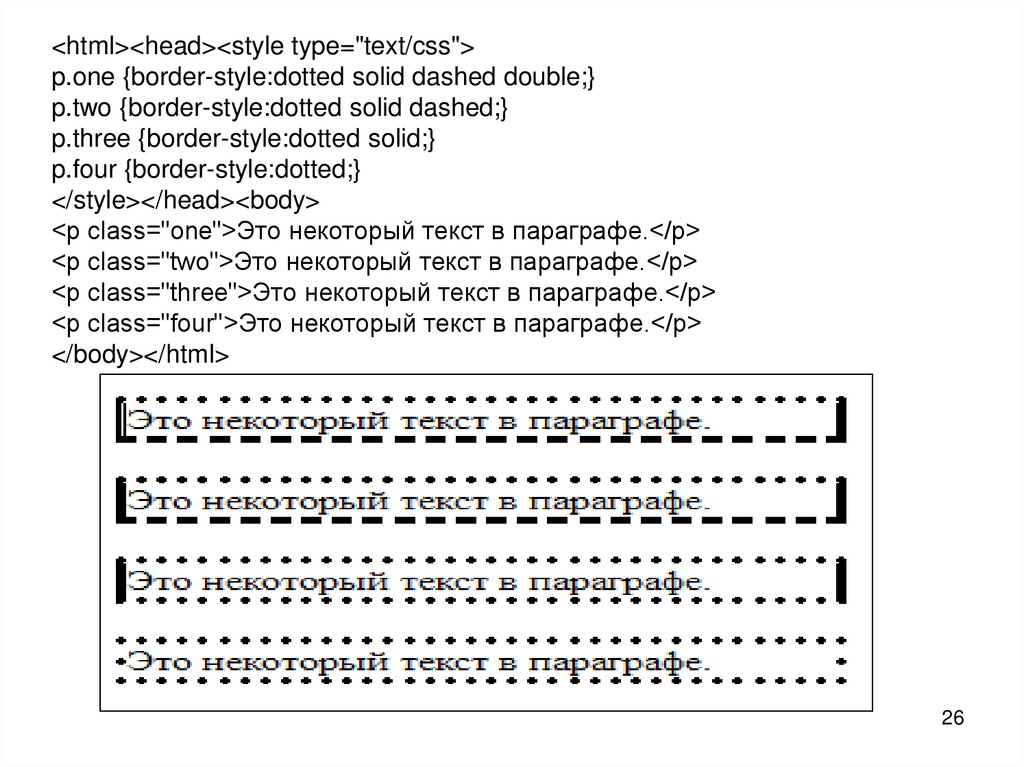 <html><head><style type="text/css">p.one {border-style:dotted solid dashed double;}