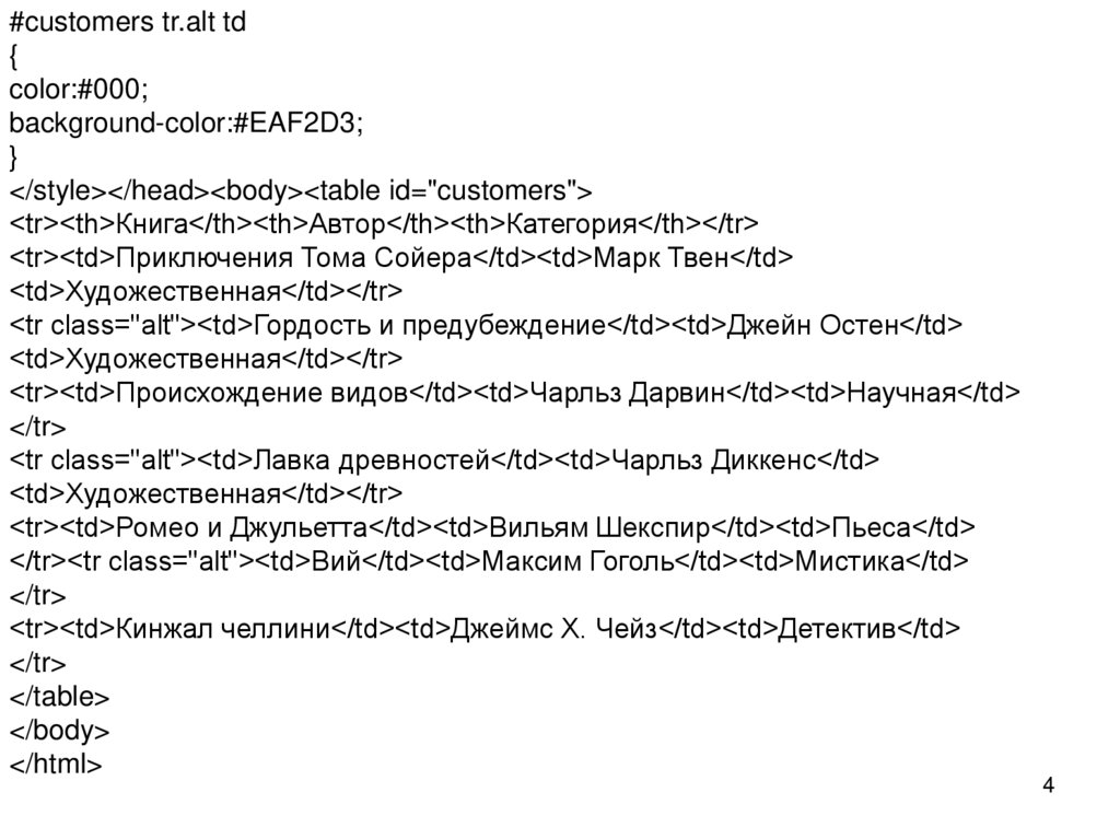<tr class="alt"><td>Гордость и предубеждение</td><td>Джейн Остен</td>