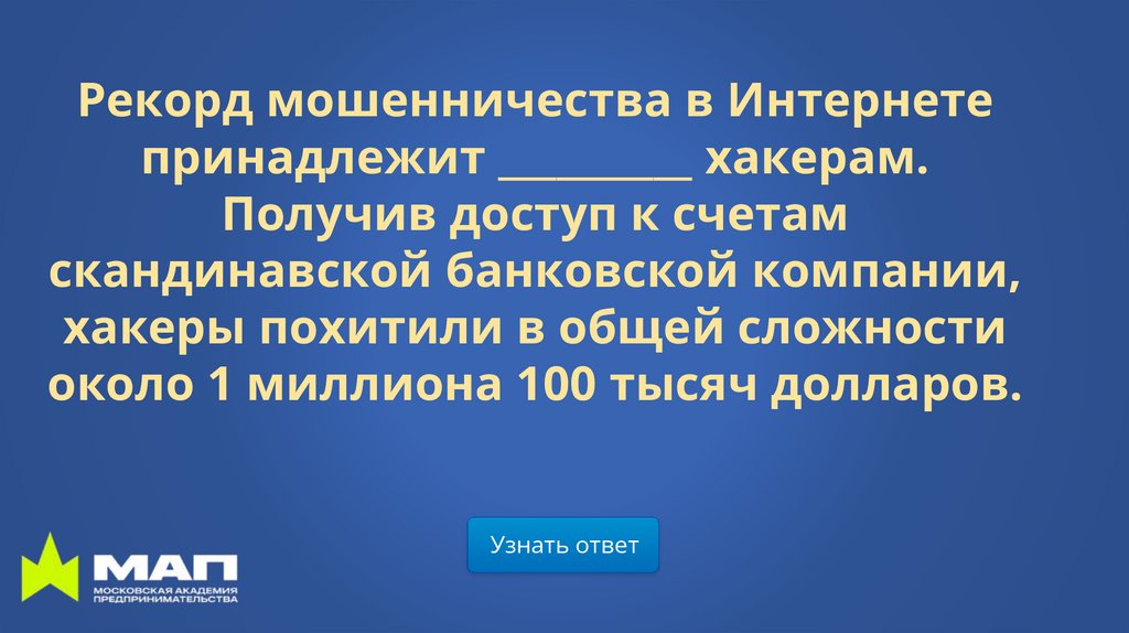 Рекорд мошенничества в Интернетепринадлежит __________ хакерам.