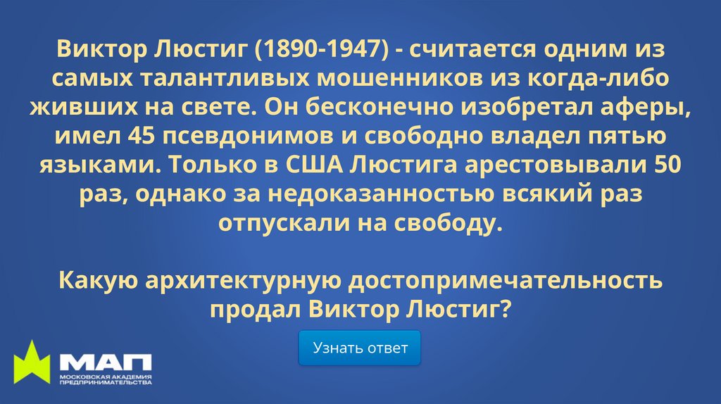 Виктор Люстиг (1890-1947) - считается одним изсамых талантливых мошенников из когда-либо