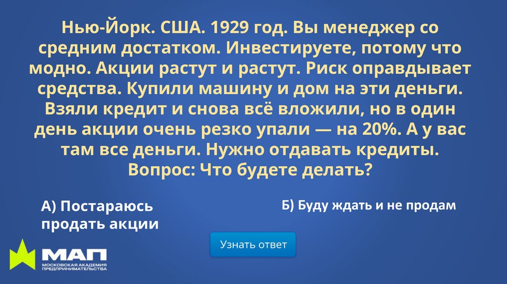 Нью-Йорк. США. 1929 год. Вы менеджер сосредним достатком. Инвестируете, потому что