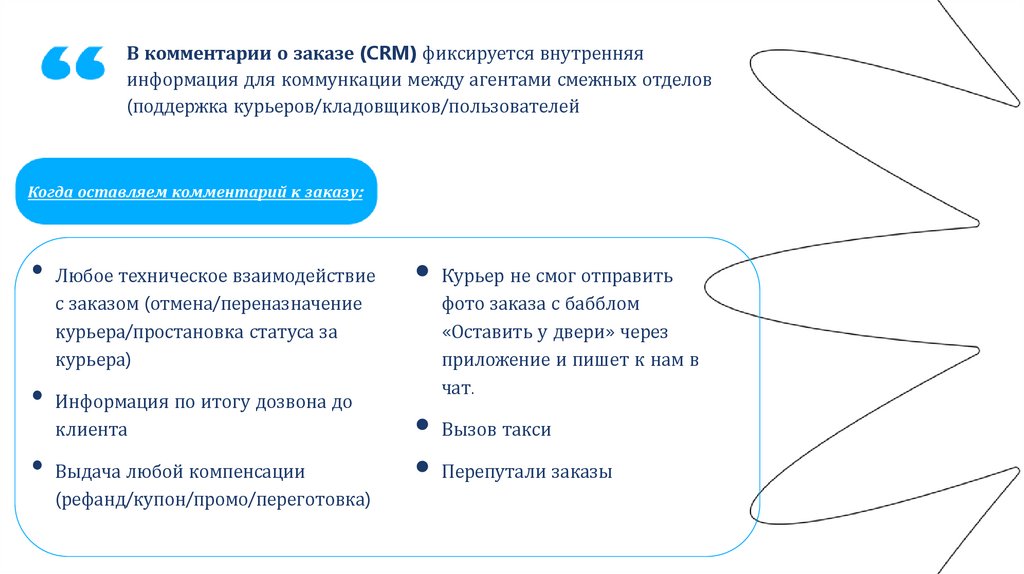 В комментарии о заказе (CRM) фиксируется внутренняяинформация для коммункации между агентами смежных отделов