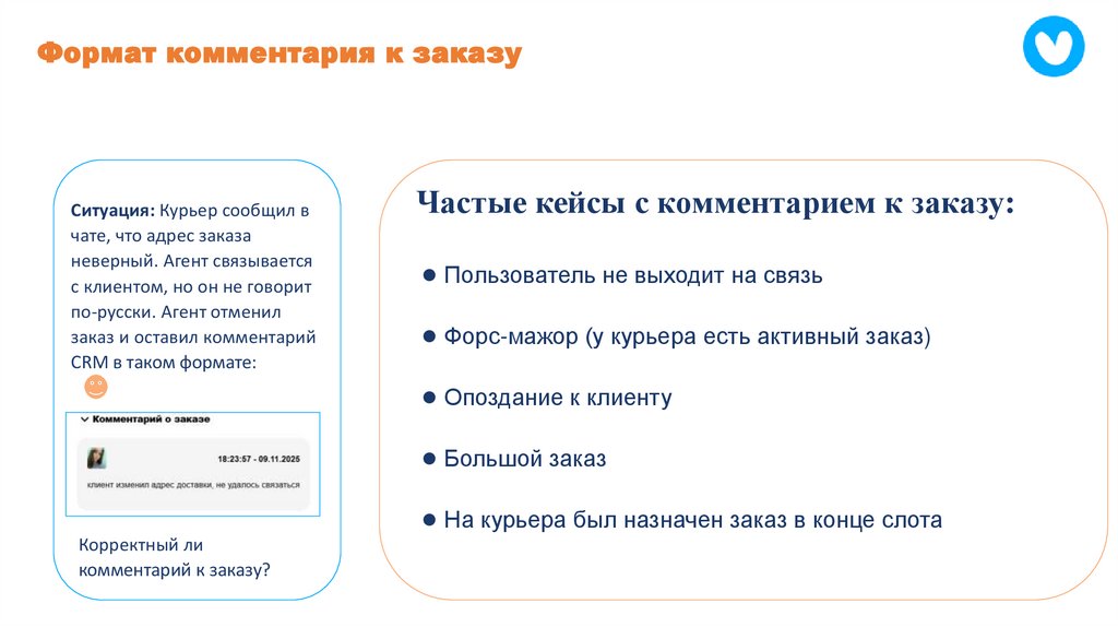 Формат комментария к заказуСитуация: Курьер сообщил в