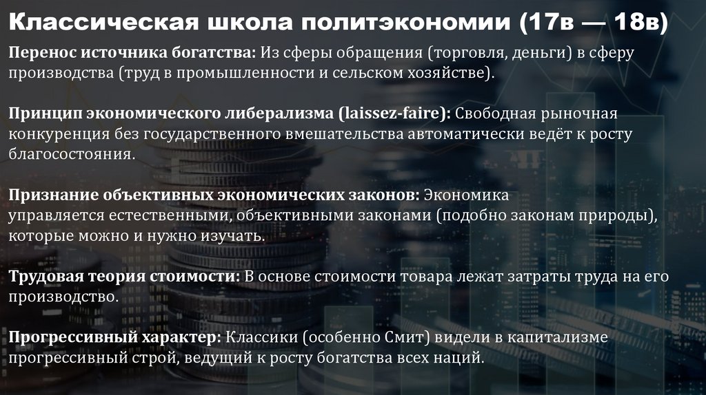 Классическая школа политэкономии (17в — 18в)Перенос источника богатства: Из сферы обращения (торговля, деньги) в сферу