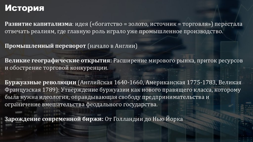 ИсторияРазвитие капитализма: идея («богатство = золото, источник = торговля») перестала