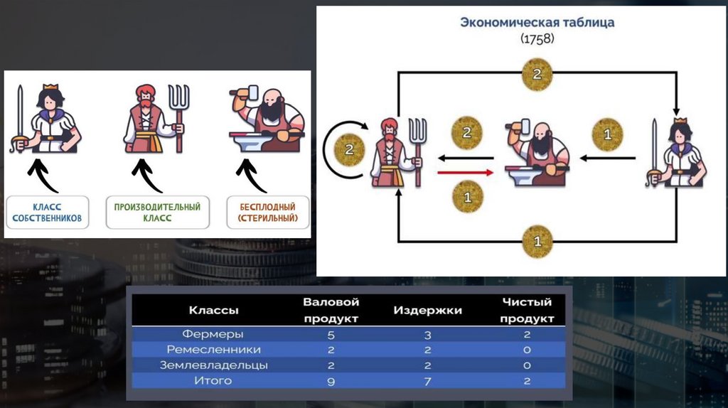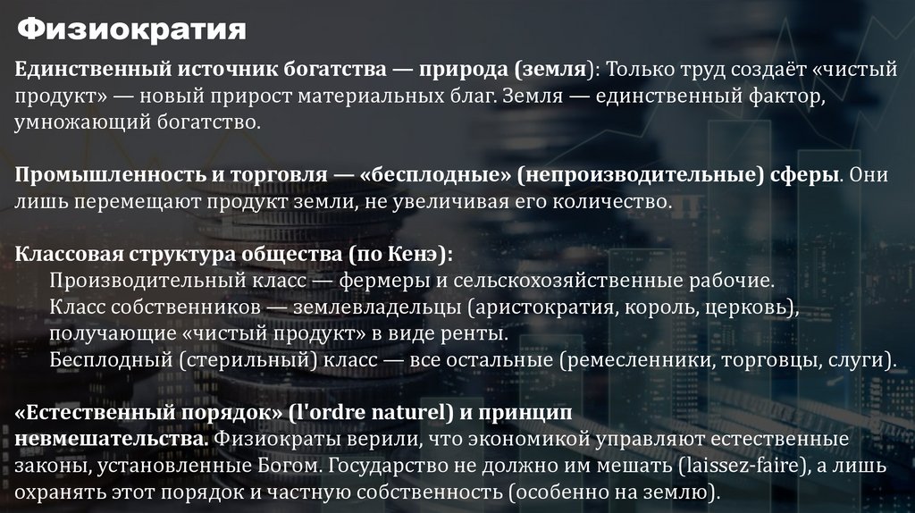 ФизиократияЕдинственный источник богатства — природа (земля): Только труд создаёт «чистый