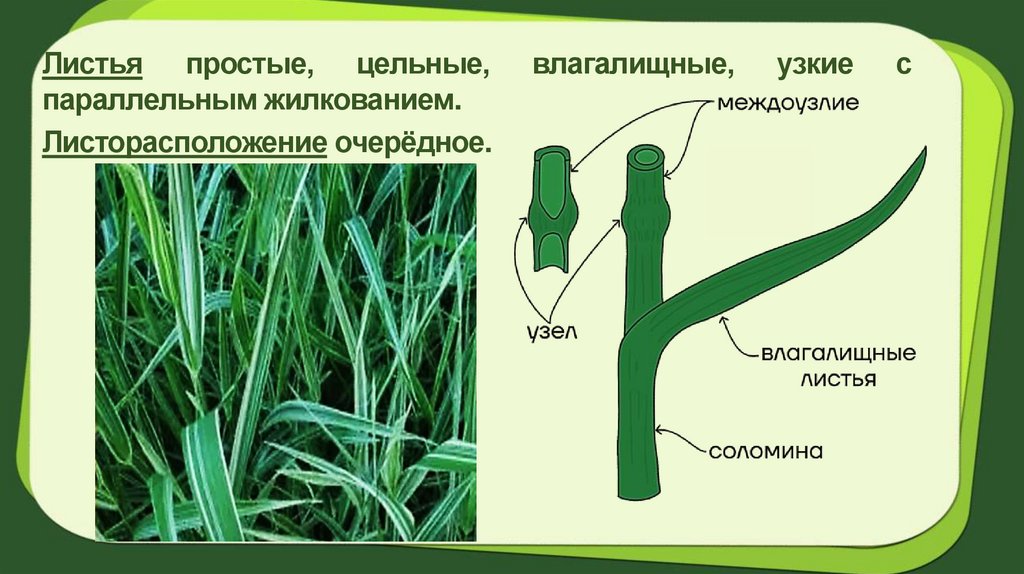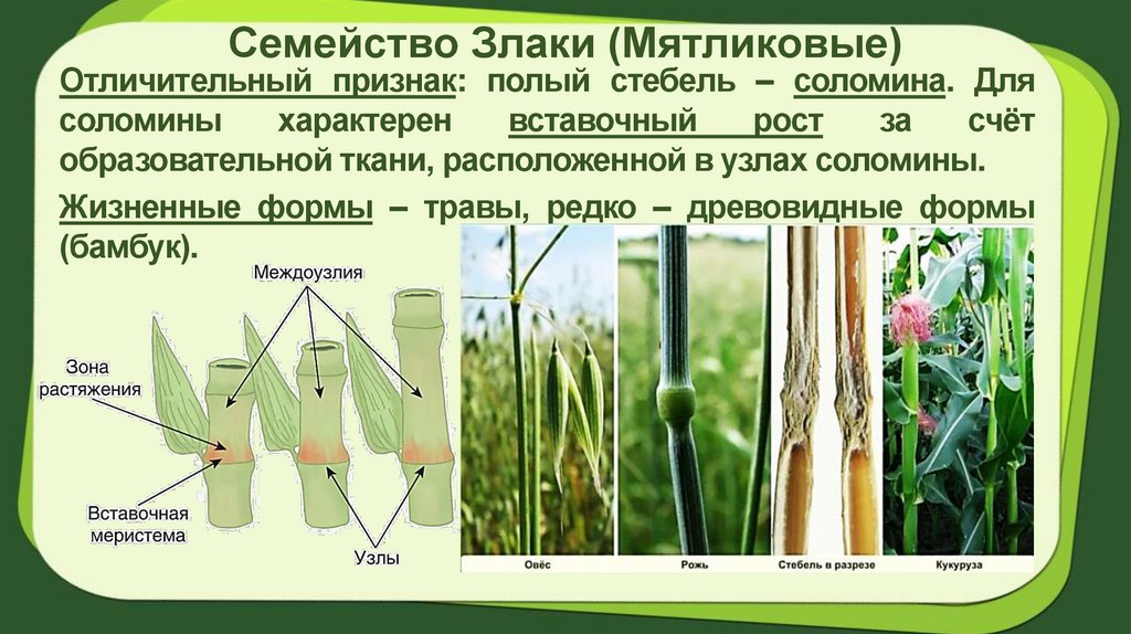 Семейство Злаки (Мятликовые)Отличительный признак: полый стебель – соломина. Для