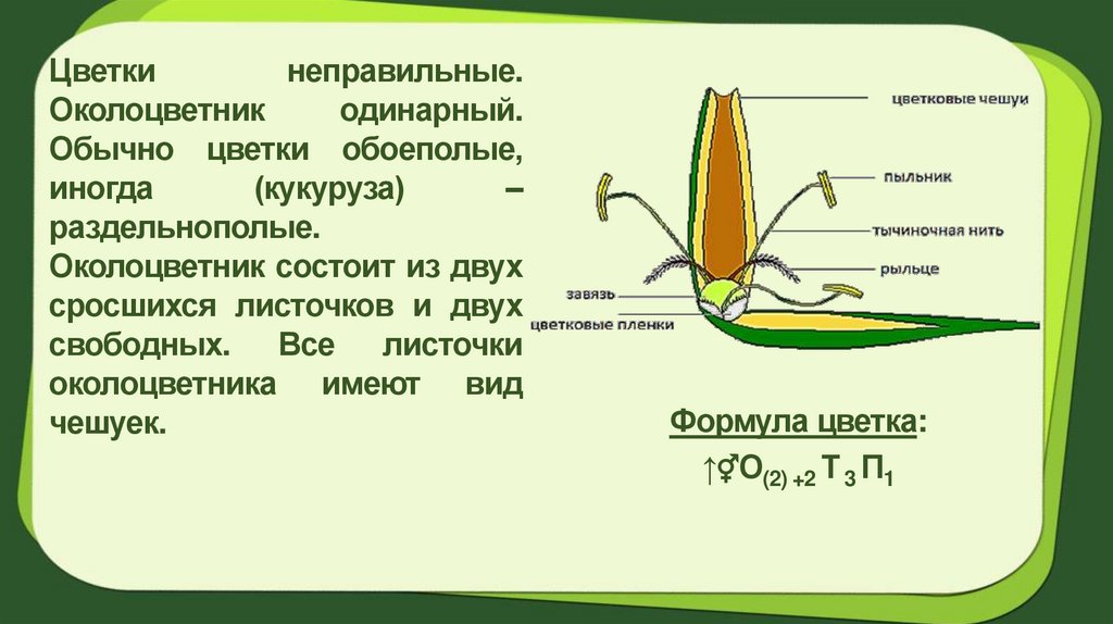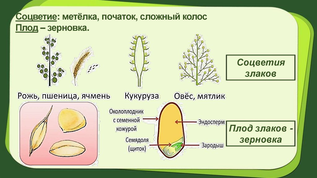 Соцветие: метёлка, початок, сложный колосПлод – зерновка.