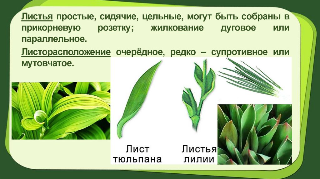 Листья простые, цельные,параллельным жилкованием.