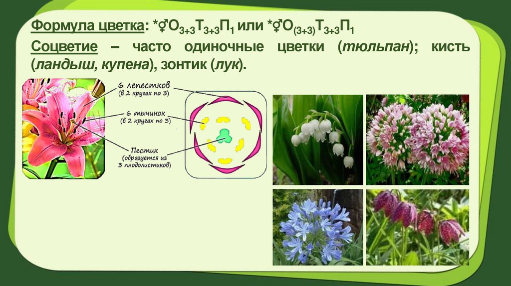 Формула цветка: *⚥О3+3Т3+3П1 или *⚥О(3+3)Т3+3П1Соцветие – часто одиночные цветки (тюльпан); кисть