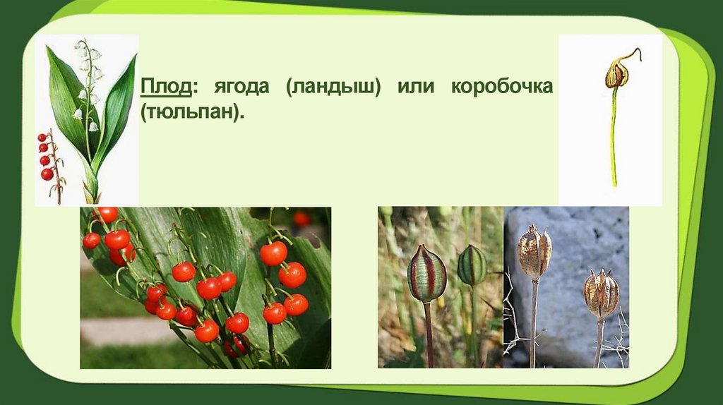Плод: ягода (ландыш) или коробочка(тюльпан).