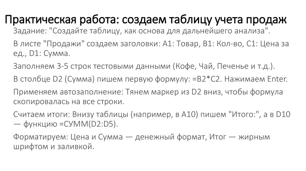 Практическая работа: создаем таблицу учета продажЗадание: "Создайте таблицу, как основа для дальнейшего анализа".