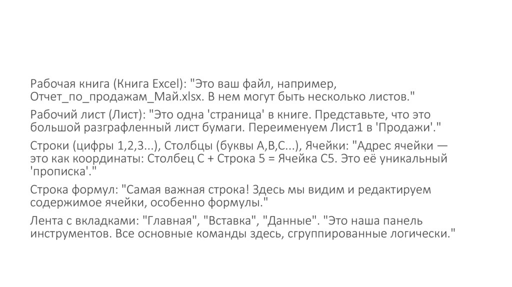 Рабочая книга (Книга Excel): "Это ваш файл, например,Отчет_по_продажам_Май.xlsx. В нем могут быть несколько листов."
