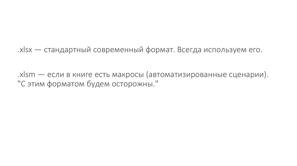 .xlsx — стандартный современный формат. Всегда используем его..xlsm — если в книге есть макросы (автоматизированные сценарии).