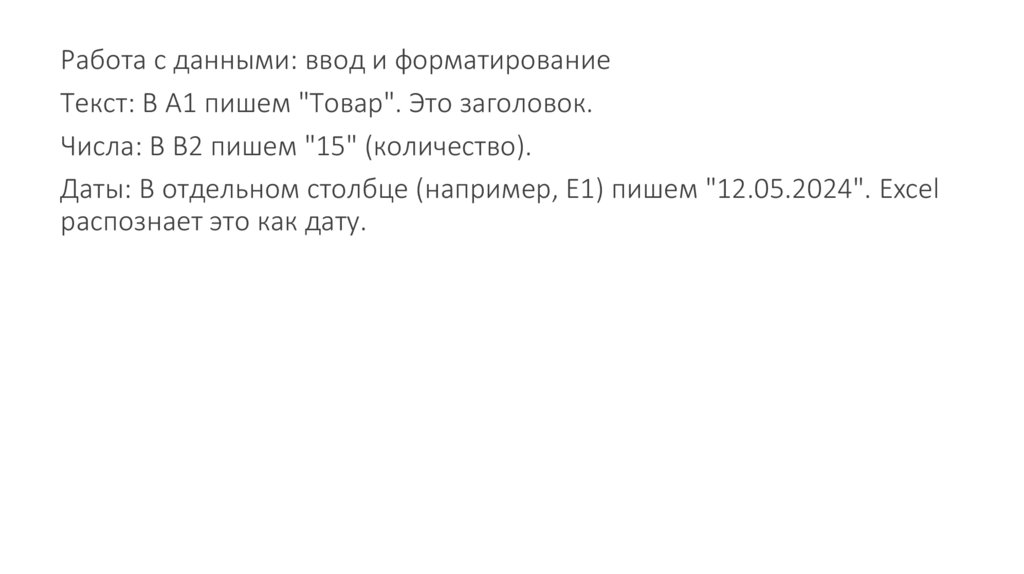 Работа с данными: ввод и форматированиеТекст: В A1 пишем "Товар". Это заголовок.