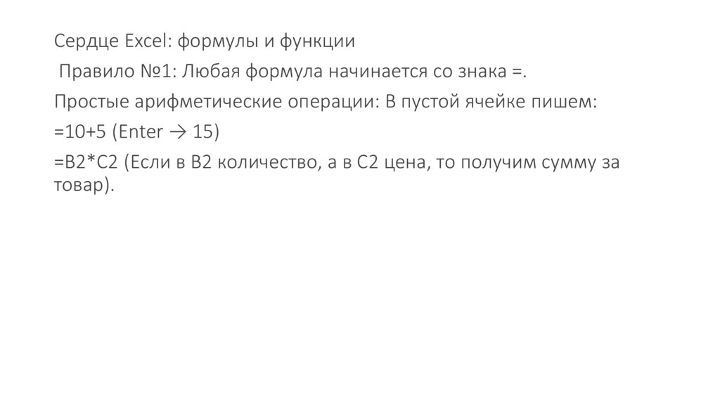 Сердце Excel: формулы и функцииПравило №1: Любая формула начинается со знака =.