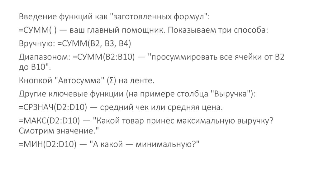 =МАКС(D2:D10) — "Какой товар принес максимальную выручку?