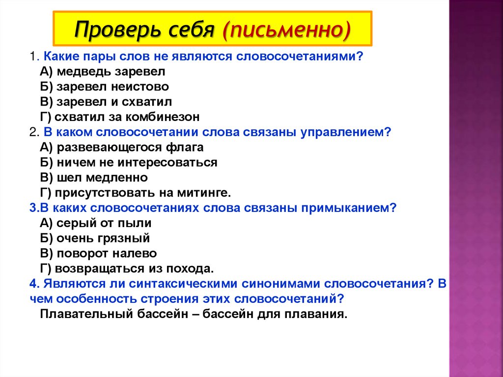 Проверь себя (письменно)1. Какие пары слов не являются словосочетаниями?