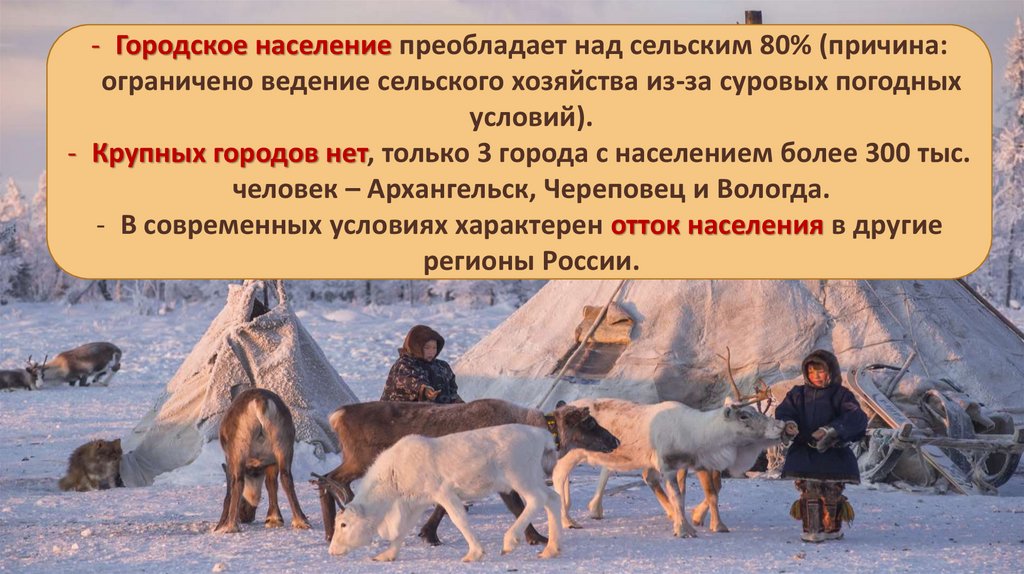 - Городское население преобладает над сельским 80% (причина:ограничено ведение сельского хозяйства из-за суровых погодных