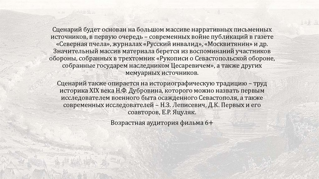 Сценарий будет основан на большом массиве нарративных письменныхисточников, в первую очередь – современных войне публикаций в газете