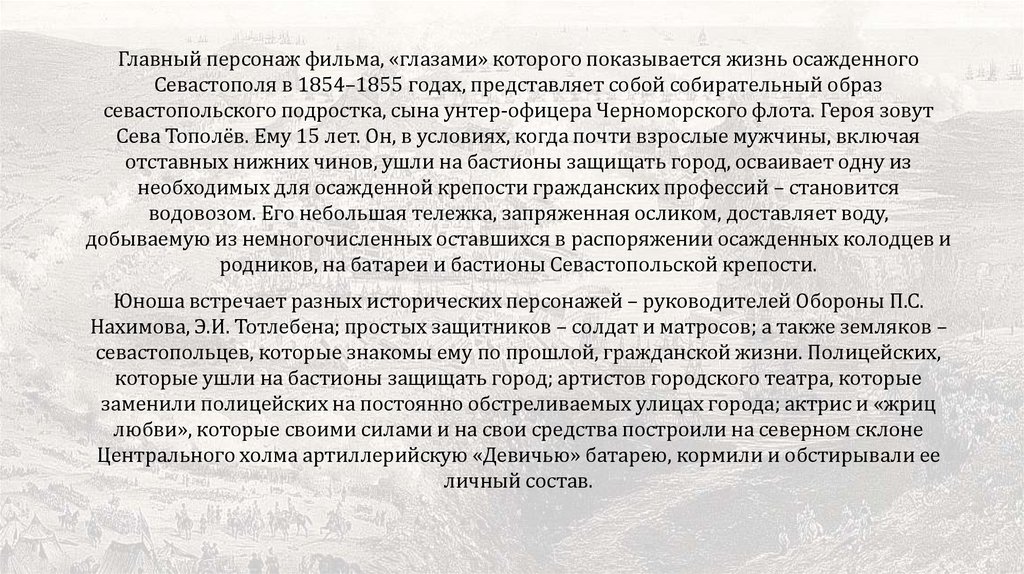 Главный персонаж фильма, «глазами» которого показывается жизнь осажденногоСевастополя в 1854–1855 годах, представляет собой собирательный образ
