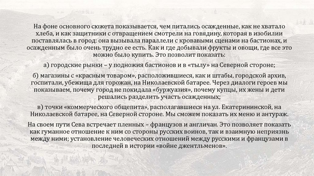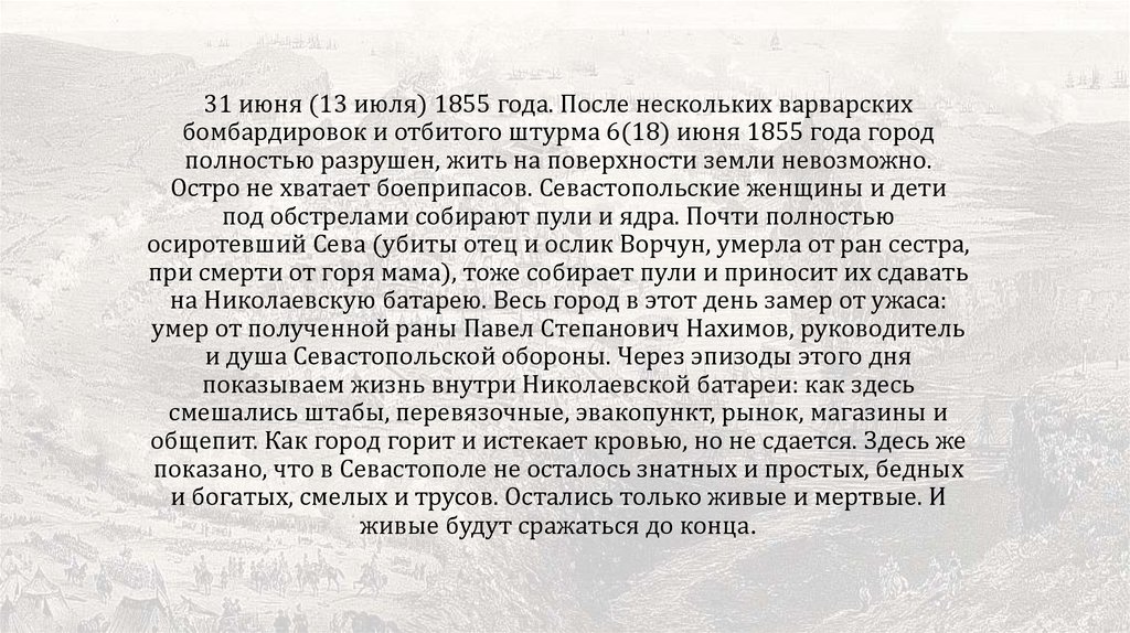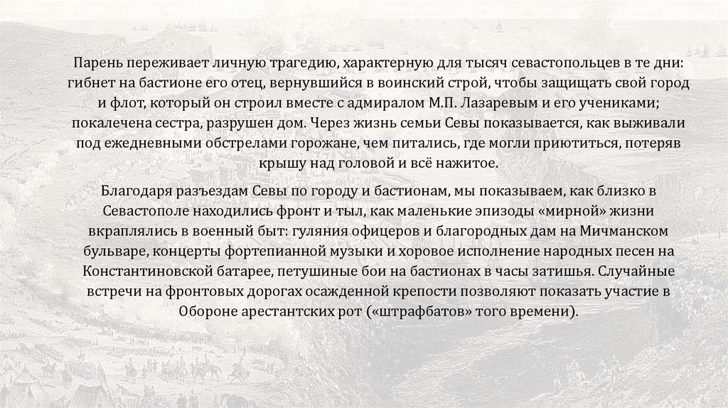 госпитали, убежища для горожан, на Николаевской батарее. Через диалоги героев мы