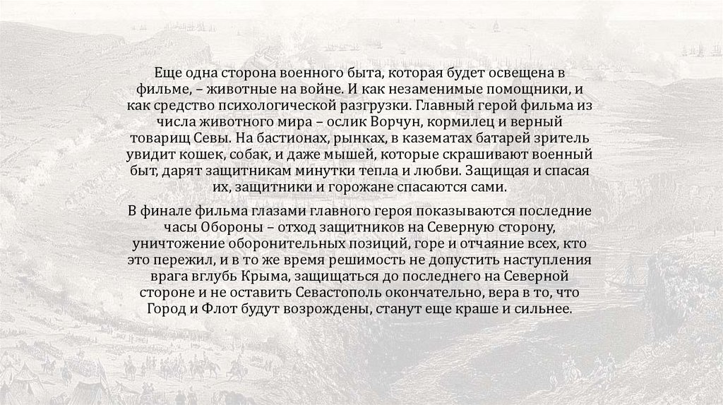 Еще одна сторона военного быта, которая будет освещена вфильме, – животные на войне. И как незаменимые помощники, и