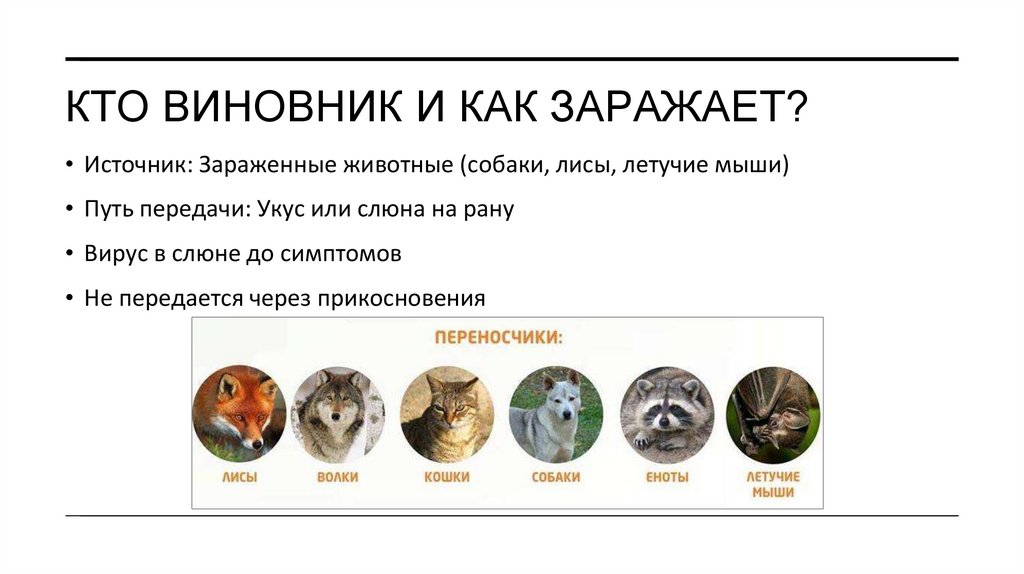 КТО ВИНОВНИК И КАК ЗАРАЖАЕТ?• Источник: Зараженные животные (собаки, лисы, летучие мыши)