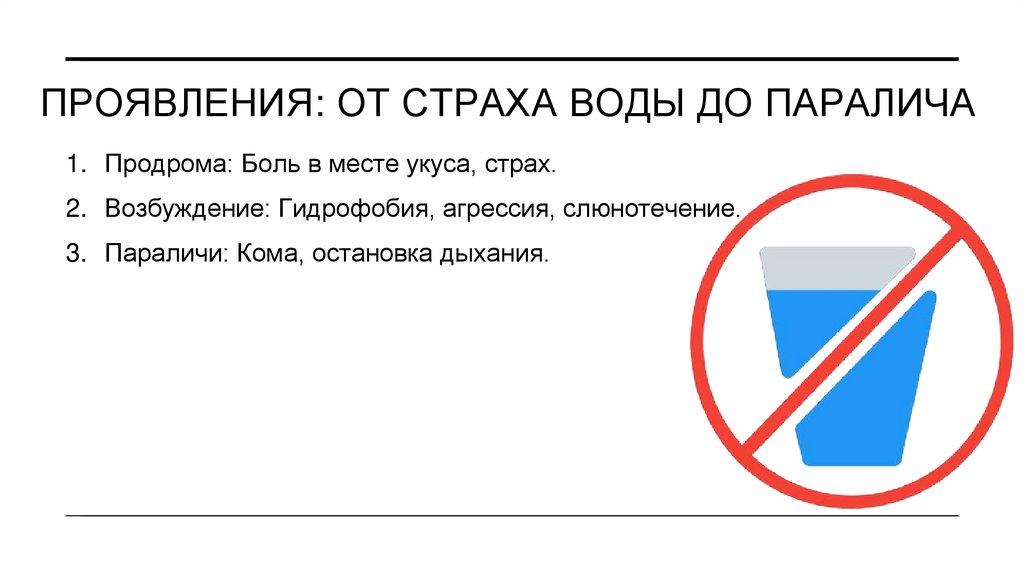 ПРОЯВЛЕНИЯ: ОТ СТРАХА ВОДЫ ДО ПАРАЛИЧА1. Продрома: Боль в месте укуса, страх.