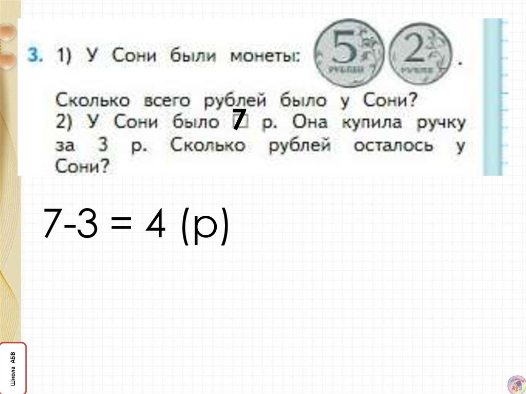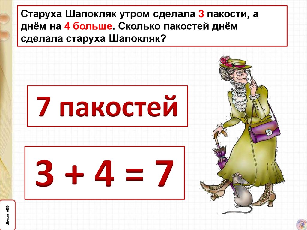 Старуха Шапокляк утром сделала 3 пакости, аднём на 4 больше. Сколько пакостей днём