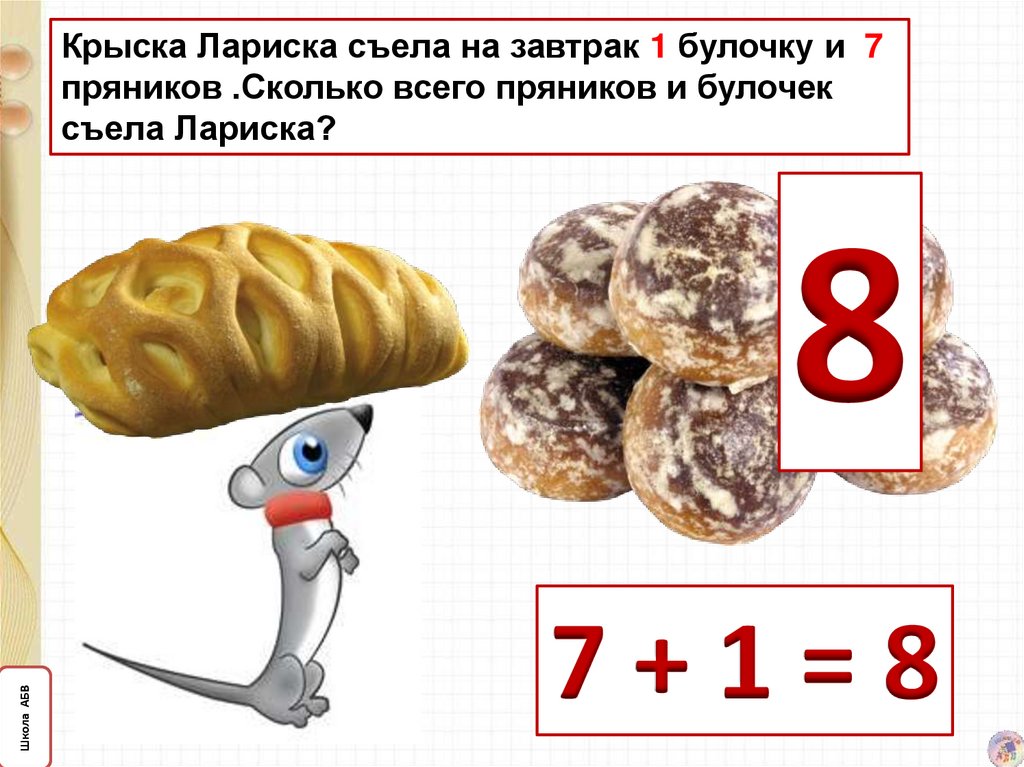 Крыска Лариска съела на завтрак 1 булочку и 7пряников .Сколько всего пряников и булочек
