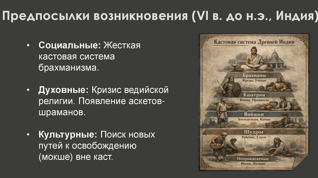 Предпосылки возникновения (VI в. до н.э., Индия)• Социальные: Жесткая