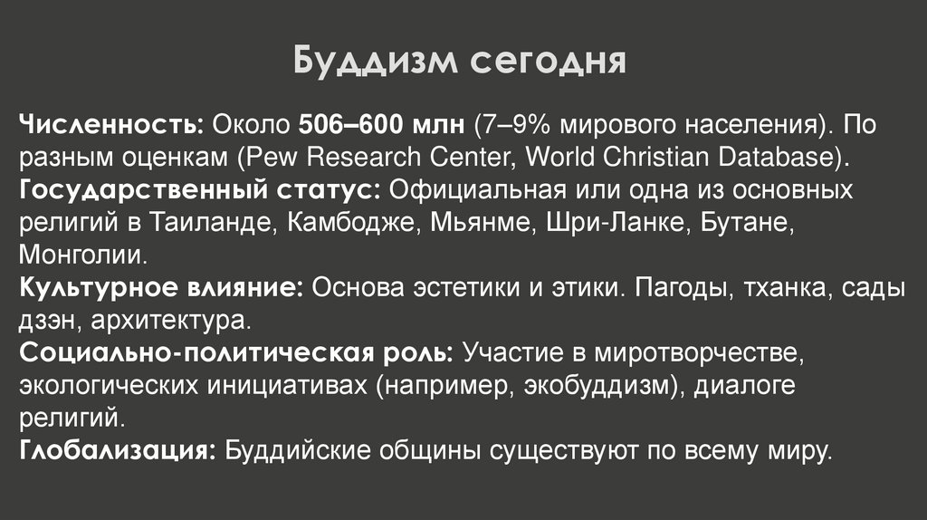 Буддизм сегодняЧисленность: Около 506–600 млн (7–9% мирового населения). По