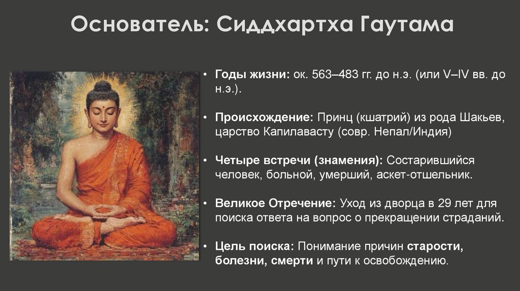 Основатель: Сиддхартха Гаутама• Годы жизни: ок. 563–483 гг. до н.э. (или V–IV вв. до