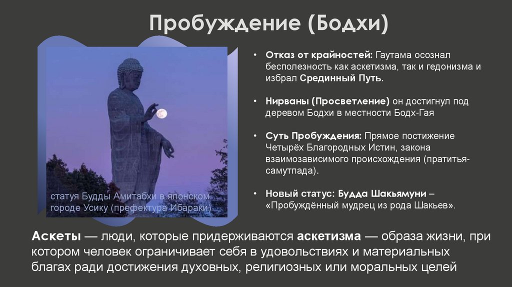 Пробуждение (Бодхи)• Отказ от крайностей: Гаутама осознал