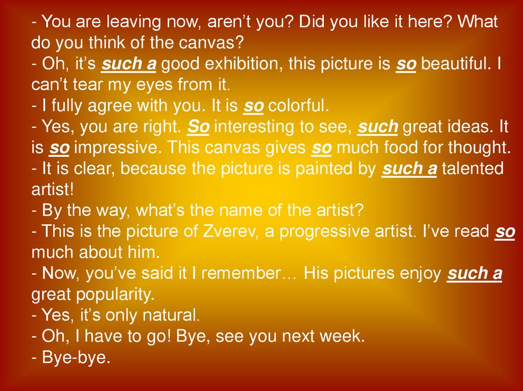 - You are leaving now, aren’t you? Did you like it here? Whatdo you think of the canvas?