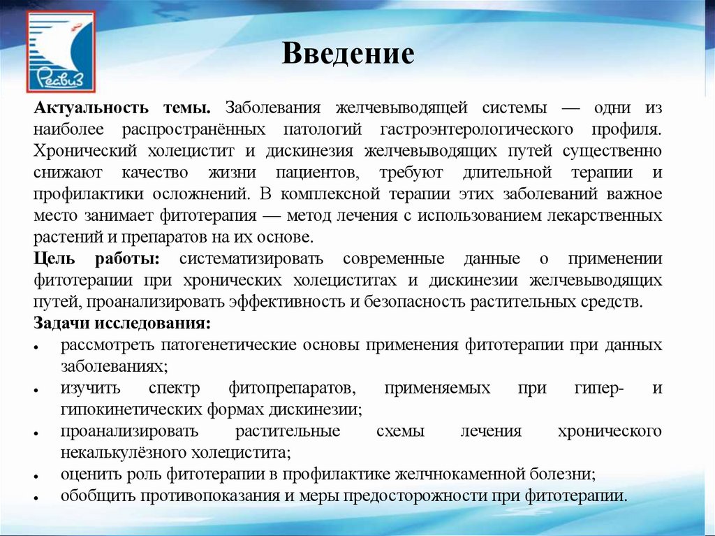 ВведениеАктуальность темы. Заболевания желчевыводящей системы — одни из