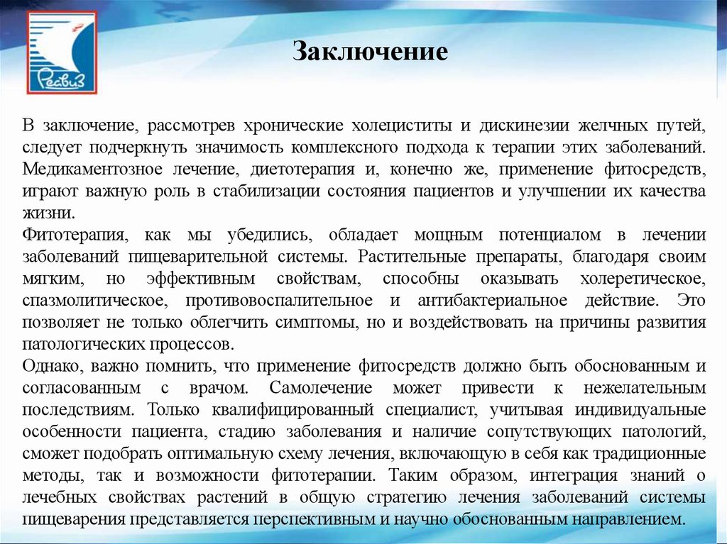 ЗаключениеВ заключение, рассмотрев хронические холециститы и дискинезии желчных путей,