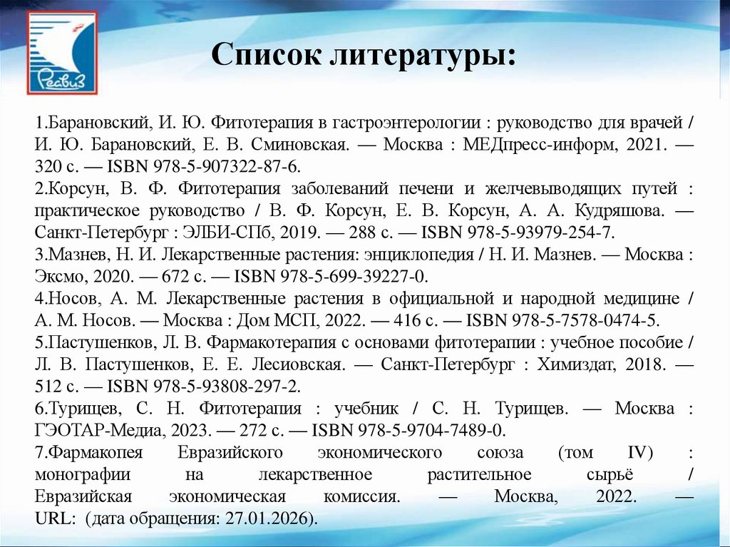 Список литературы:1.Барановский, И. Ю. Фитотерапия в гастроэнтерологии : руководство для врачей /