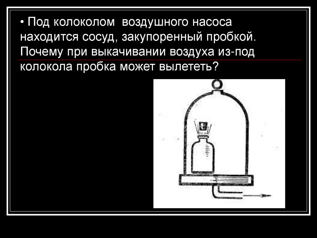 • Под колоколом воздушного насосанаходится сосуд, закупоренный пробкой.